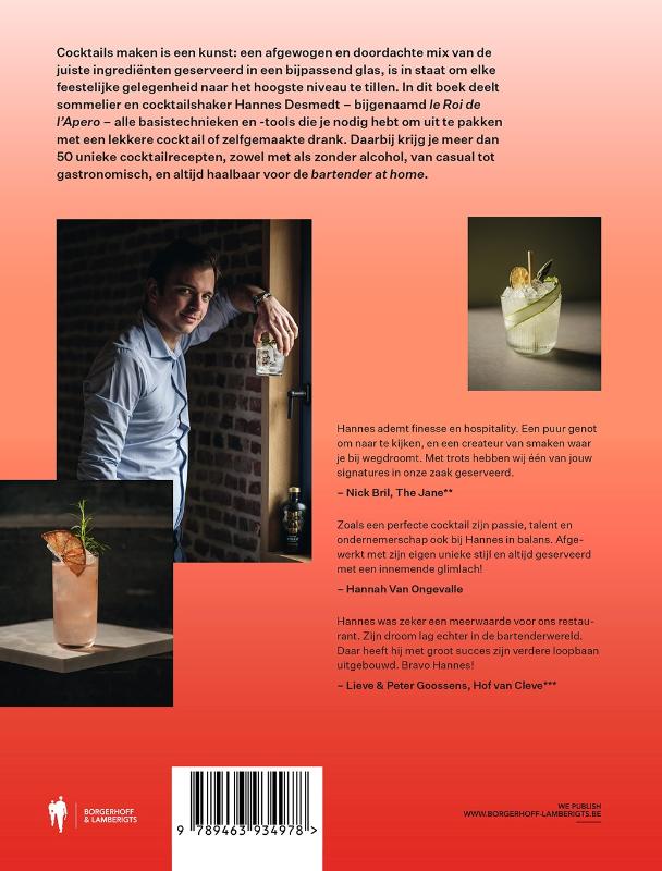 Cocktails maken is meer dan wat lekkere drankjes en sapjes bij elkaar gieten. Wie de moeite neemt om zich onder te dompelen in het wereldje van jiggers, shakers, spirits en mixers ontdekt al snel de meerwaarde van een met passie bereide cocktail. Een afgewogen en doordachte mix van de juiste ingrediënten geserveerd in een bijpassend glas, is in staat om elke feestelijke gelegenheid naar het hoogste niveau te tillen. Vanuit zijn ervaring met de Belgische cocktailcultuur deelt sommelier en cocktailshaker Hannes Desmedt, bijgenaamd le Roi de l’Apero, zijn inzichten over onze boeiende cocktailwereld. Hannes draait al enkele jaren mee in de hoogste kringen van de Belgische bartenderscene. Hij leerde de kneepjes van het vak bij Hertog Jan en Hof van Cleve. In dit boek geeft hij de basistechnieken en -tools mee aan iedereen met de ambitie om eens uit te pakken met een lekkere cocktail of een eigen gemaakte drank. Daarbij krijg je meer dan 50 unieke cocktailrecepten – zowel met als zonder alcohol – waarbij de focus telkens op smaak ligt. Van casual tot gastronomisch, soms makkelijk en dan weer wat ambitieuzer maar altijd haalbaar voor de bartender at home.