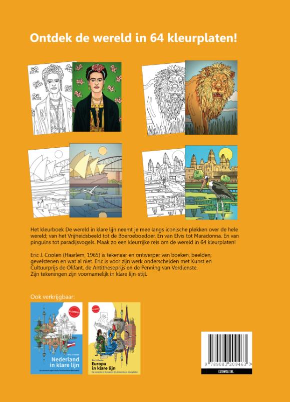Na het succes van Nederland in klare lijn en Europa in klare lijn neemt Eric J. Coolen je dit keer mee langs iconische plekken over de hele wereld. Wat te denken van het Vrijheidsbeeld, de Opera in Sydney en Angkor Wat in Cambodja. En van Elvis tot Maradonna. En van pinguïns tot paradijsvogels. Maar ook van Elvis, Frida Kahlo en vele anderen ontbreken niet. Goed voor vele uren kleurplezier! ERIC J. COOLEN (Haarlem, 1965) is tekenaar en ontwerper van boeken, beelden, gevelstenen, glas-in-loodramen en wat niet al. Eric won in 2013 Kunst- en Cultuurprijs de Olifant en ontving in 2015 de Penning van Verdienste en in 2017 de Antithese-prijs. Zijn tekeningen zijn voornamelijk in klare lijn-stijl.