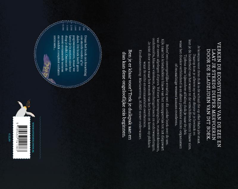Bladerbare onderzeereis VERKEN DE ECOSYSTEMEN VAN DE ZEE EN LAAT JE STEEDS DIEPER MEE NAAR BENEDEN VOEREN DOOR DE BLADZIJDEN VAN DIT BOEK. Ga op onderzoek uit in de zee. Dit bijzondere boek neemt je mee naar beneden, steeds dieper en dieper de zee in. De liniaal aan de linkerkant van elke pagina is je houvast op weg naar de diepste, donkere bodem van de zee. Je reist door zones waar het wemelt van het leven en komt op plekken waar het vooral stil en eenzaam is. Wat kom je allemaal tegen? Van pinguïns en vissen, onderzeeërs en reuzeninktvissen tot de vreemde wezens die in het 11 kilometer diepe Marianentrog leven. Blader jezelf de diepte in! Ben je er klaar voor? Trek je duikpak aan en dan kan deze ongelooflijke reis beginnen.