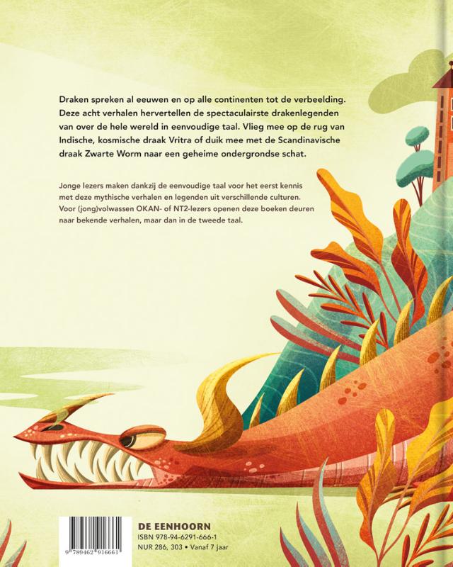 - Acht spannende verhalen per boek, met rijkelijke en kleurrijke illustraties. - Eenvoudig geschreven (AVI M4), voor beginnende lezers of anderstalige (jong)volwassenen. Twee boeken boordevol spannende drakenverhalen in eenvoudige taal. Draken spreken al eeuwen en op alle continenten tot de verbeelding. Deze twee boeken hervertellen de spectaculairste drakenlegenden in eenvoudige taal. Vlieg mee op de rug van Indische, kosmische draak Vitra of duik mee met de Scandinavische draak Zwarte Worm naar een geheime ondergrondse schat. Jonge lezers maken zo voor het eerst kennis met deze mythische verhalen en legenden van over de hele wereld. Voor (jong)volwassen OKAN- of NT2-lezers openen deze boeken deuren naar bekende verhalen, maar dan in de tweede taal.