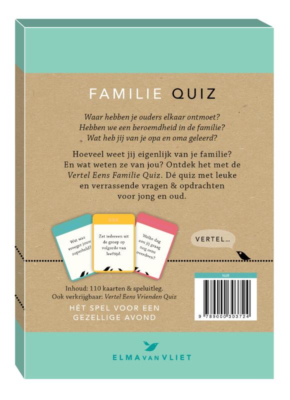 Vrolijk vragenspel om jouw familie nog beter te leren kennen. Je kent elkaar als geen ander, je bent tenslotte familie. Toch zijn er waarschijnlijk ontzettend interessante en grappige weetjes over je opa, oma, ouders, broer of zus die je nooit eerder hebt gehoord. Met de Vertel Eens Familie Quiz van Elma van Vliet ontdek je het op de leukste manier. Een luchtig vragenspel voor jong en oud, met hetzelfde uitgangspunt als de Vertel eens-boeken: elkaar nog beter leren kennen en samen herinneringen ophalen. Wat heeft je broer bijvoorbeeld met zijn eerste salaris gedaan? Hoe laat ben je geboren? En waar hebben je opa en oma elkaar eigenlijk ontmoet? De 110 mooi vormgegeven spelkaartjes zorgen voor verrassende gesprekken, hilarische anekdotes en nog meer verhalen van de mensen die je het beste kent. Heerlijk voor een gezellige avond met familie. Geschikt voor 3-8 spelers van 8-99 jaar. Ook in deze serie: Vertel Eens Vriendinnen Quiz, Vertel Eens Vrienden Quiz en Vertel Eens Winter Quiz. Elma van Vliet is bekend geworden met het boek Mam, vertel eens, dat ze maakte voor haar moeder toen die ernstig ziek werd en ze haar nog zoveel wilde vragen. Het werd het eerste in een reeks producten die helpen bij het maken, delen en bewaren van dierbare herinneringen. Elma’s boeken en spellen zorgen in de drukke wereld waarin we leven voor écht contact met de mensen om ons heen.