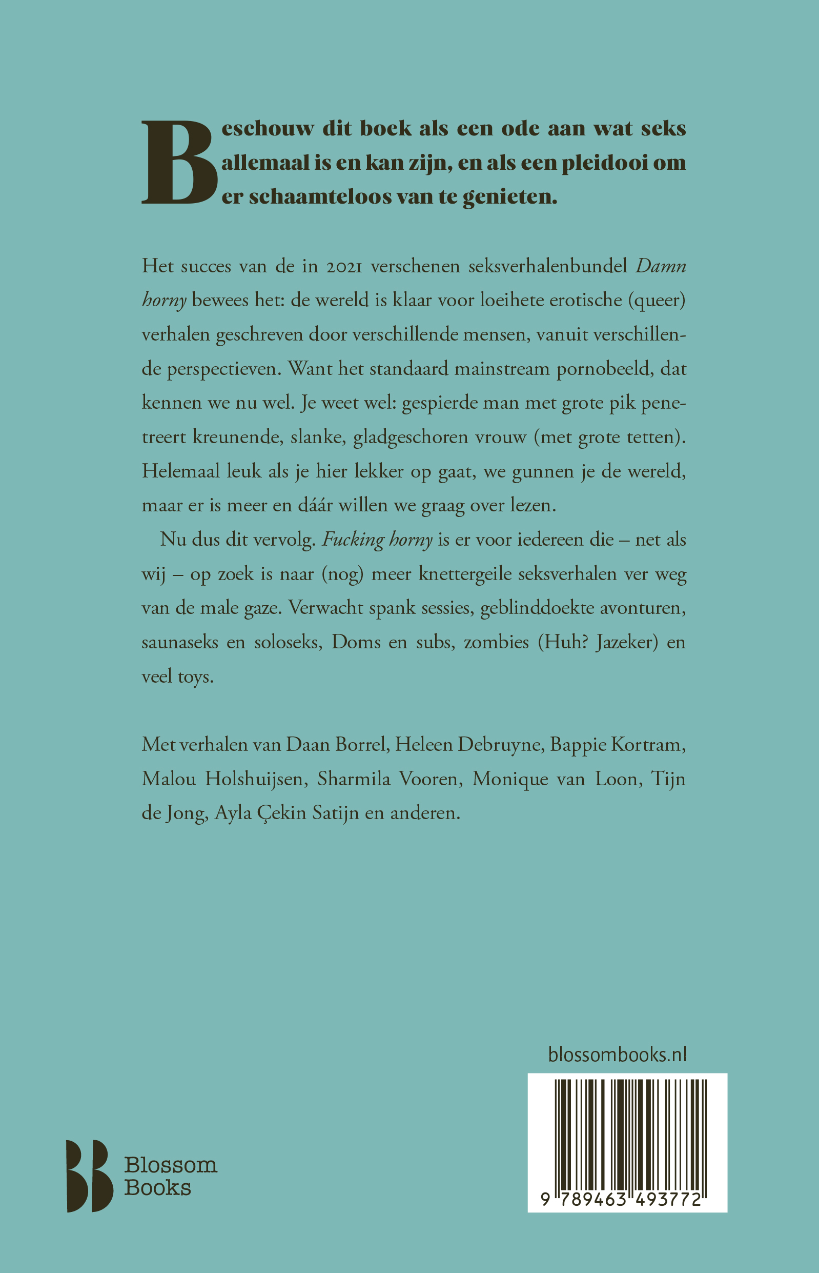 Beschouw dit boek als een ode aan wat seks allemaal is en kan zijn, en als een pleidooi om er schaamteloos van te genieten. Het succes van de in 2021 verschenen seksverhalenbundel 'Damn horny' bewees het: de wereld is klaar voor loeihete erotische (queer) verhalen geschreven door verschillende mensen, vanuit verschillende perspectieven. Want het standaard mainstream pornobeeld, dat kennen we nu wel. Je weet wel: gespierde man met grote pik pentreert kreunende, slanke, gladgeschoren vrouw (met grote tetten). Helemaal leuk als je hier lekker op gaat, we gunnen je de wereld, maar er is meer en dáár willen we graag over lezen.' Nu dus dit vervolg. 'Fucking horny' is er voor iedereen die – net als wij – op zoek is naar (nog) meer knettergeile seksverhalen ver weg van de male gaze. Verwacht spank sessies, geblinddoekte avonturen, saunaseks en soloseks, Doms en subs, zombies (Huh? Jazeker) en veel toys. >br> Met verhalen van Daan Borrel, Heleen Debruyne, Bappie Kortram, Malou Holshuijsen, Sharmila Vooren, Monique van Loon, Tijn de Jong, Ayla Çekin Satijn en anderen.