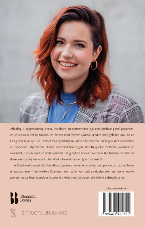 ‘Werkdruk kan heftig zijn: we willen veel opgeven voor onze doelen, plannen en idealen maar ondertussen willen we ook graag iedereen tevreden houden. Ik weet hoe het is.’ Cynthia Schultz hielp al vele duizenden mensen productiever en effectiever te werken, zowel met haar Structuurjunkie-producten als haar (online) cursussen. In 'Goed werk' bundelt Cynthia al haar kennis over plannen en productiever (thuis)werken. Hiervoor put zij uit alle management- en zelfhulpboeken die zij heeft gelezen, alsook uit haar jarenlange ervaring als drukbezet ondernemer. Cynthia’s stokpaardje: hoe meer je gedaan krijgt in een korter tijdsbestek, hoe meer tijd je over hebt om leuke dingen te doen.