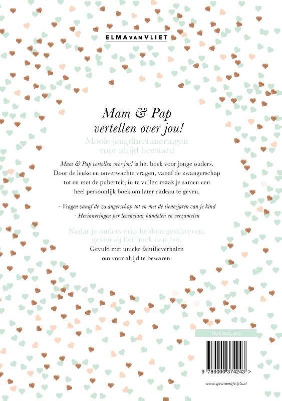 Een bijzonder cadeau voor je kind dat je zelf vult met waardevolle herinneringen voor later. 'Wat was een van de mooiste momenten tijdens de zwangerschap? Was ik verlegen als kleuter? Welke eigenschappen van jezelf zie je terug in mij? Welke dromen en wensen heb je nog voor mij?' Mam & Pap vertellen over jou, is hét boek vol boeiende en ontroerende vragen over de zwangerschap en de baby-, peuter-, kleuter- en tienertijd van je kind. In de eerste levensjaren van je kind gaan de ontwikkelingen razendsnel. Zo snel, dat je je ze later vaak niet meer kunt herinneren. In het boek leg je alle grote en kleine momenten van je kind vast. Dit is geen 'gewoon' babyboek. Het leuke is dat je kind zelf ook meeschrijft aan zijn/haar eigen boek. Het boek bevat vragen voor elk levensjaar voor jullie als ouders, vanaf de zwangerschap tot aan de tienerjaren, én vragen aan je kind om samen in te vullen. Door het invullen van het boek maak je een uniek en persoonlijk boek voor en over je kind. Een boek dat je later, gevuld met herinneringen en verhalen cadeau kunt geven.