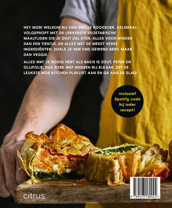 'Mob Veggie' is het ultieme vegetarische kookboek, met alles wat je nodig hebt om perfecte vegetarische gerechten te maken. Je zult nooit meer worstelen met een veggie of vegan alternatief voor je vrienden die geen vlees eten, in dit boek vind je het. En alles voor minder dan een tientje. Ieder recept bevat een Spotify code, zodat je die kunt scannen en direct kunt gaan koken met de juiste muziek aan. Het boek is ingedeeld in zes hoofdstukken: Brunch Mob voor lekkere brunchgerechten. Verse Mob, vol eenvoudige salades, soepen en uitbundige groentegerechten. Snelle Mob: alles is binnen een half uurtje klaar. Easy Mob: eenpansgerechten die zo weinig mogelijk afwas opleveren na een groots diner. Het vijfde hoofdstuk is Mob de luxe: deze recepten hebben iets meer aandacht nodig en zijn zeer geschikt voor een feestje in het weekend. Het laatste hoofdstuk is Fakeaway mob: take away fast food, maar dan veggie en huisgemaakt.