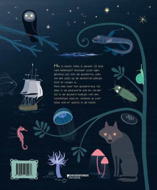 Het is nacht. Alles is donker. Of toch niet helemaal? Wanneer onze ogen gewend zijn aan de duisternis, zien we dat zelfs op de donkerste plekjes licht te vinden is. Reis mee naar het duistere bos, tot diep in de pikzwarte zee en verder tot in de donkere hoekjes van een nachtelijke stad en verbaas je over alles wat er oplicht in de nacht.