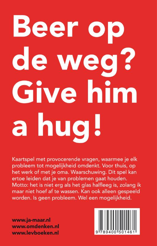 Een kaartspel met provocerende vragen, waarmee je elk probleem tot een mogelijkheid omdenkt. Voor thuis, op het werk of met je oma. Waarschuwing. Dit spel kan ertoe leiden dat je van problemen gaat houden. Motto: het is niet erg als het glas halfleeg is, zolang ik maar niet hoef af te wassen. Kan ook alleen gespeeld worden. Is geen probleem. Wel een mogelijkheid.Beer op de weg? Give him a hug!
