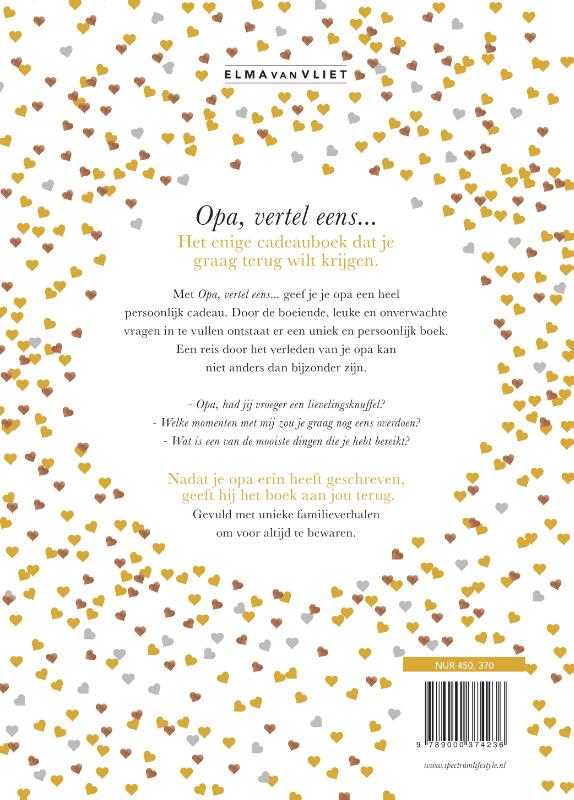 Geef voor Vaderdag dit album cadeau en krijg het met waardevolle verhalen weer terug. Opa, vertel eens nu in een nieuw design! 'Opa, had jij vroeger een lievelingsknuffel? Welke momenten met mij zou je graag nog eens overdoen? Wat is een van de mooiste dingen die je ooit hebt bereikt?' Met Opa, vertel eens geef je je opa een ultiem invulboek cadeau: je geeft aan dat je alles wilt weten over zijn herinneringen, dromen en wensen. Door het invullen van de leuke en onverwachte vragen over onderwerpen zoals zijn kindertijd, verliefd zijn, opa worden en de bijzondere band tussen opa en kleinkind, schrijft je opa stap voor stap zijn levensverhaal. Of maak het nog specialer door het boek samen in te vullen en in gesprek te gaan. Zo ontstaat er een uniek en persoonlijk boek van jullie samen. Als je opa het boek heeft ingevuld, geeft hij het weer terug aan jou. Het eerste boek in de reeks, Mam, vertel eens, werd een ongeëvenaard succes: inmiddels gaat in Nederland de 46ste druk over de toonbank en wordt deze klassieker in zestien landen verkocht. Daarom heeft Mam, vertel eens een nieuw ontwerp gekregen! Een eigentijds design met vrolijk binnenwerk en een rijk stofomslag waarvan de binnenzijde is opgemaakt als prachtig cadeaupapier. Leuk om zo het ingevulde boek weer ingepakt terug te geven aan degene die het je gaf! Elma van Vliet is bekend geworden met het boek Mam, vertel eens, dat ze maakte voor haar moeder toen die ernstig ziek werd en ze haar nog zoveel wilde vragen. Het werd het eerste in een reeks producten die helpen bij het maken, delen en bewaren van dierbare herinneringen. Elma's boeken en spellen zorgen in de drukke wereld waarin we leven voor écht contact met de mensen om ons heen.