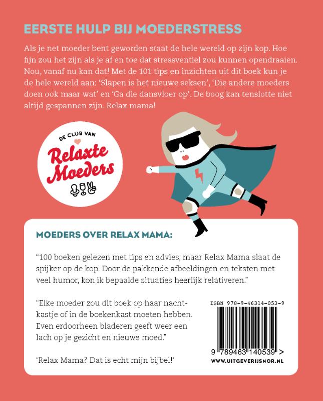 Als je net moeder bent geworden staat de hele wereld op zijn kop. Hoe fijn zou het zijn als je af en toe dat stressventiel zou kunnen opendraaien. Nou, vanaf nu kan dat! Met de 101 tips en inzichten uit dit boek kun je de hele wereld aan: ‘Slapen is het nieuwe seksen’, ‘Die andere moeders doen ook maar wat’ en ‘Ga die dansvloer op’. De boog kan tenslotte niet altijd gespannen zijn. Relax mama! Moeders over Relax Mama: “100 boeken gelezen met tips en advies, maar Relax Mama slaat de spijker op de kop. Door de pakkende afbeeldingen en teksten met veel humor, kon ik bepaalde situaties heerlijk relativeren.” “Elke moeder zou dit boek op haar nachtkastje of in de boekenkast moeten hebben. Even erdoorheen bladeren geeft weer een lach op je gezicht en nieuwe moed.” "Relax Mama? Dat is echt mijn bijbel!"
