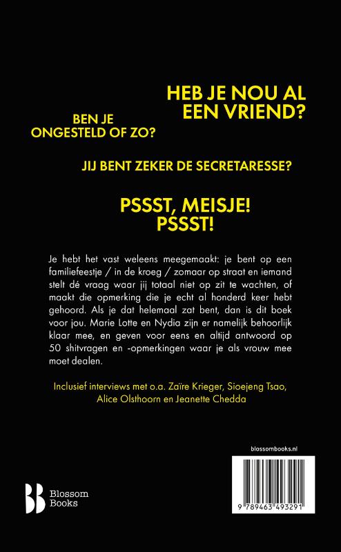 Pssst. Meisje! Pssst! Deze is voor jou! 's Nederlands bekendste feministen Marie Lotte Hagen en Nydia van Voorthuizen verwierven sinds het verschijnen van hun eerste pamflet landelijke bekendheid. Mediakanalen als Elle, BNNVARA, NPO Radio 1, Linda, VICE en Bedrock besteedden aandacht aan het duo. In dit boek duiken Marie Lotte en Nydia in 50 ongepaste opmerkingen en vragen die vrouwen regelmatig naar hun hoofd geslingerd krijgen. Ben je ongesteld of zo? Zou je dat wel doen, nog een hap? Jij bent zeker de secretaresse! Had je maar geen rokje aan moet trekken. Van die opmerkingen waarvan je achteraf denkt: had ik maar iets scherps teruggezegd. Na het lezen van dit handboek sta je nooit meer met een mond vol tanden, want de auteurs leggen niet alleen uit wat er precies mis is, ze geven ook rake comebacks. 'Shit waar je als vrouw mee moet dealen - het handboek' is een herziene heruitgave van 'Heb je nou al een vriend?'.