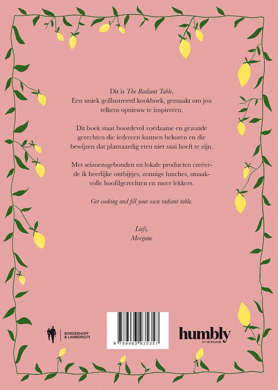 In ‘The Radiant Table’ staan natuurlijke en voedzame gerechten centraal. Morgane wil de lezer inspireren en duidelijk maken dat plantaardig eten niet saai hoeft te zijn. De gezonde gerechten zitten stuk voor stuk boordevol smaak. Bovendien zijn ze eenvoudig om te maken: complexe keukenapparatuur of exotische ingrediënten zijn overbodig. Integendeel: de auteur werkt zoveel mogelijk met lokale en seizoensgebonden producten. Het boek telt meer dan 45 recepten, voor ieder moment van de dag. Heerlijke ontbijtjes, zonnige lunches en brunches en smaakvolle hoofdgerechten. Ook desserts en aperitief kunnen niet ontbreken. Morgane Van Marcke is mode- en interieurblogger met een enorme voorliefde voor de plantaardige keuken. Haar blog Humbly by Morgane combineert al deze elementen volgens haar geheel eigen stijl, die dit boek volledig uniek maakt.