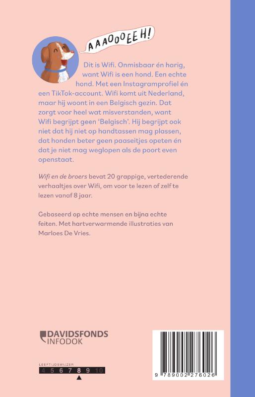Dit is Wifi. Onmisbaar én harig, want Wifi is een hond. Een echte hond. Met een Instagramprofiel én een TikTok-account. Wifi komt uit Nederland, maar hij woont in een Belgisch gezin. Dat zorgt voor heel wat misverstanden, want Wifi begrijpt geen ‘Belgisch’. Hij begrijpt ook niet dat hij niet op handtassen mag plassen, dat honden beter geen paaseitjes opeten én dat je niet mag weglopen als de poort even openstaat. Wifi en de broers bevat 20 grappige, vertederende verhaaltjes over Wifi, om voor te lezen of zelf te lezen vanaf 8 jaar. Gebaseerd op echte mensen en bijna echte feiten. Met hartverwarmende illustraties van Marloes De Vries.